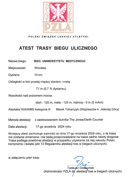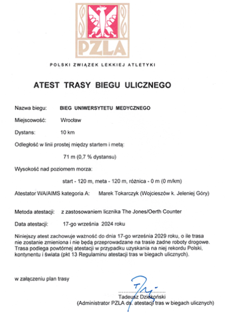 Bezpieczeństwo zawodników to nasz priorytet, dlatego prezentujemy atest naszej trasy Biegu przyznany przez Polski Związek Lekkiej Atletyki, co oznacza, że: